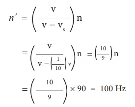உடைய ஒலி மூலமானது, 30 மீவி-1 வேகத்தில் கேட்குநரை நோக்கி நகர்கிறது. காற்றில் ஒலியின் வேகம் 330 மீவி-1 எனில் கேட்குநரால் உணரப்படும்