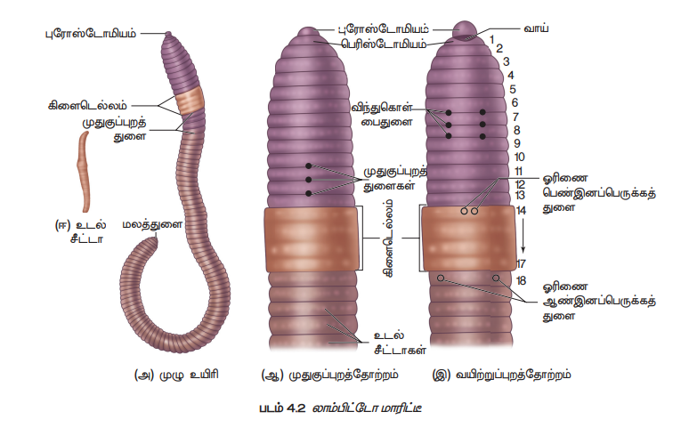 புறத்தோற்றம் (Morphology), உள்ளுறுப்பு அமைப்பு , செரிமான மண்டலம், சுவாச மண்டலம், இரத்த ஓட்ட மண்டலம், நரம்பு மண்டலம், கழிவு நீக்க மண்டலம், இனப்பெருக்க மண்டலம், வாழ்க்கை சுழற்சி - மண்புழு - லாம்பிட்டோ மாரிட்டீ | 11th Zoology : Chapter 4 : Organ and Organ Systems in Animals