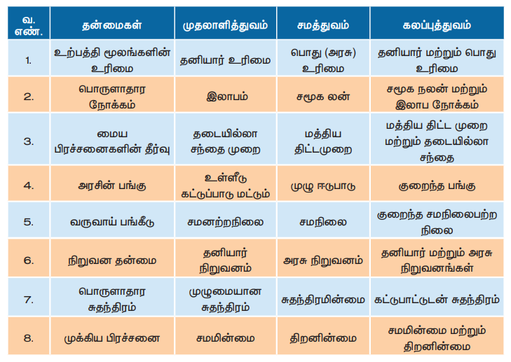 முதலாளித்துவம் மற்றும் சமத்துவம் ஆகிய இரு அணுகுமுறைகளும் ஒன்றுக்கொன்று எதிரிடையானது. முதலாளித்துவ பொருளாதாரத்தில், தனியார் உற்பத்தி நிறுவனங்களுக்கு முழு சுதந்திரம் உள்ளது. சமத்துவ பொருளாதாரத்தில், தனியார் நிறுவனத்திற்கு சுதந்திரம் இல்லை. மாறாக உற்பத்தியில் அனைத்து செயல்பாடுகளும் பொதுவுடைமை ஆக்கப்படும். கலப்பு பொருளாதார அமைப்பு என்பது முதலாளித்துவம், சமத்துவம் ஆகிய இரண்டின் இயல்புகளையும் உள்ளடக்கியது. கீழ்கண்ட பகுதியில் பல்வேறு பொருளாதார அமைப்பு முறைகளின் இயல்புகள், நன்மைகள் மற்றும் குறைகள் விளக்கப்பட்டு உள்ளன.