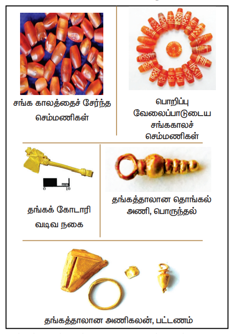 தங்கத்தாலான அணிகலன்களைச் சங்க கால மகளிர் பரவலாக அணிந்தனர். ரோமானியர்களின் நாணயங்களைக் கொண்டும் நகைகள் செய்யப்பட்டன. கேரளத்தின் பட்டணத்தில் பொன்னை உருக்கும் உலைகள் இருந்ததற்கான சான்றுகள் கிடைத்துள்ளன. பெருங்கற்காலத்தைச் சேர்ந்த அகழாய்வுக் களங்களான சுத்துக்கேணி,