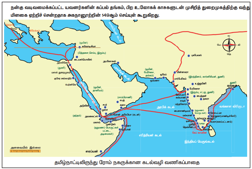 கிழக்கிலும் மேற்கிலும் பல வெளிநாடுகளுடன் தமிழர்கள் வணிகத் தொடர்பு வைத்திருந்தனர். ரோமானியக் கப்பல்கள் பருவக்காற்று வீசும் சமயத்தில் மேலைக்கடலான அரபிக்கடலைக் கடந்து தமிழகக் கடற்கரைகளுக்கு வந்தன. மிளகு போன்ற நறுமணப் பொருள்களும், யானைத் தந்தம், நவமணிகள் உள்ளிட்ட அரிய பொருள்களும் தமிழ்நாட்டிலிருந்து ஏற்றுமதி ஆயின. தங்கம்,