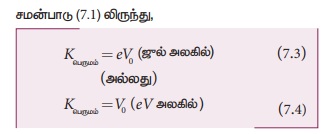 எலக்ட்ரானின் ஆரம்ப இயக்க ஆற்றலானது (Kபெரும்), நிறுத்து மின்னழுத்தத்தினால்