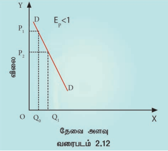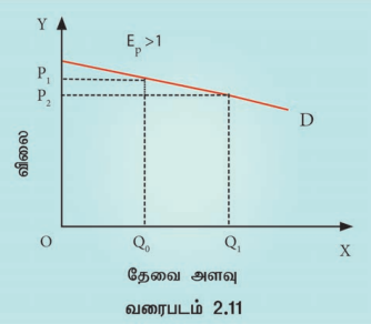வரைபடம் 2.11 ஐப் பார்க்கவும். இதில் விலையானது ₹10 -லிருந்து 9ஆக குறைந்துள்ளது, இது 10% குறைவு ஆகும். தேவை 5 லிருந்து 10 ஆக உயர்கிறது, இது 100% உயர்வாகும். எனவே, இவ்வரைபடம் மிகைத் தேவை நெகிழ்ச்சியைக் காட்டுகிறது.