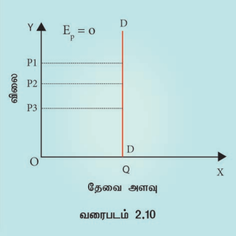 வரைபடத்தில் விலை P1, P2 மற்றும் P3 ஆக மாறினாலும் தேவை அளவு மாற்றமில்லாமல் OQ அளவில் இருக்கிறது. அப்படியானால் முற்றிலும் நெகிழ்ச்சியற்ற தேவையாகும்.