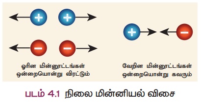 மின்னூட்டங்களுக்கிடையில் ஏற்படும் மின்விசை (F) இரு வகைப்படும். ஒன்று கவர்ச்சி விசை, மற்றொன்று விலக்கு விசை. ஓரின மின்னூட்டங்கள் ஒன்றையொன்று விரட்டும்; வேறின மின்னூட்டங்கள் ஒன்றையொன்று கவரும் (படம் 4.1).