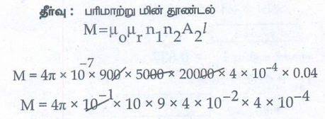15. 2 cm ஆரம் மற்றும் 200 சுற்றுகள் கொண்ட வட்டவடிவ கம்பிச்சுருளானது 3 cm ஆரமுள்ள நீண்ட வரிச்சுருளுக்குள் பொது அச்சுள்ள வகையில் வைக்கப்பட்டுள்ளது. வரிச்சுருளின் சுற்று அடர்த்தி 90 சுற்றுகள் / செமீ எனில், சுருள் மற்றும் வரிச்சுருள் இடையிலான பரிமாற்று மின்தூண்டல் எண்ணைக் கணக்கிடுக.