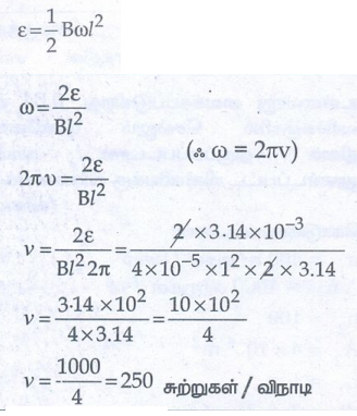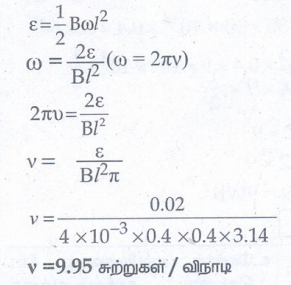 7. 0.4m நீள இறக்கைகள் கொண்ட ஒரு விசிறி 4 × 10−3T காந்தப்புலத்திற்கு குத்தாக சுழலுகிறது. இறக்கையின் மையத்திற்கும் விளிம்பிற்கும் இடையே தூண்டப்பட்ட மின்னியக்கு விசை 0.02 V எனில், இறக்கை சுழலும் வீதத்தைக் கணக்கிடுக.