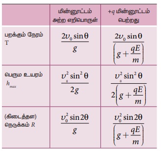 (g + qE/m) > g ஆகையால், T,hmax ’R இம்மூன்றுஅளவுகளுமே மின்னூட்டமற்ற நிலையில் உள்ள அளவுகளை விடக் குறைந்த மதிப்பைப் பெற்றிருக்கும். மின்னூட்டமானது -q எனில்,
