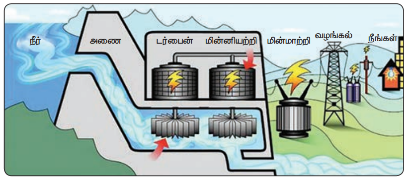 ● நீர் மின் நிலையங்களில், நீரின் இயக்க ஆற்றலானது மின்னாற்றலாக மாற்றப்படுகிறது.
