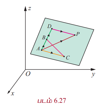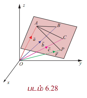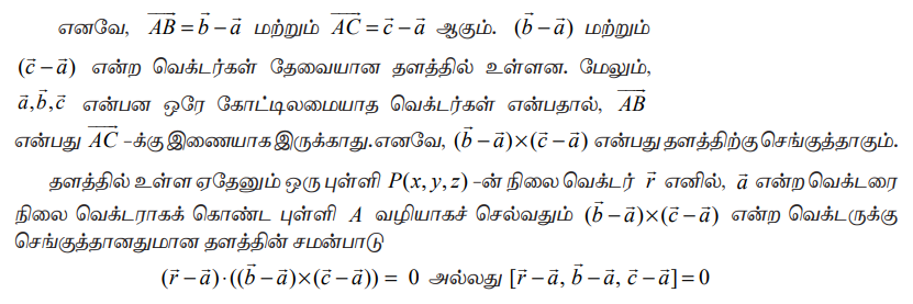வரையறை, தேற்றம், நிரூபணம் - கொடுக்கப்பட்ட ஒரே கோட்டிலமையாத மூன்று புள்ளிகள் வழியாகச் செல்லும் தளத்தின் சமன்பாடு (Equation of a plane passing through three given non−collinear points) | 12th Maths : UNIT 6 : Applications of Vector Algebra