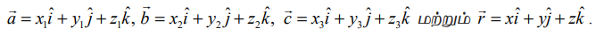 என்ற வெக்டரை நிலை வெக்டராகக் கொண்ட P என்ற புள்ளியின் அச்சுத்தூரங்கள் (x,y,z) எனில்,