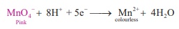 ஆக்சிஜனொடுக்கம்: MnO4- + 8H+ + 5e- → Mn2+ + 4H2O