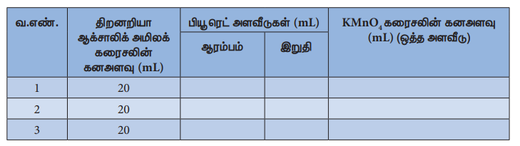 பருமனறி பகுப்பாய்வின் மூலம் கொடுக்கப்பட்டுள்ள செறிவறியா ஆக்சாலிக் அமிலக் கரைசலில் 500mLல் கரைந்துள்ள படிக ஆக்சாலிக் அமிலத்தின் நிறையினைத் தீர்மானித்தல். இதற்கென, 0.1N திறனுடைய திட்ட பெர்ரஸ் அம்மோனியம் சல்பேட் கரைசல் மற்றும் பொட்டாசியம் பெர்மாங்கனேட் இணைப்புக் கரைசல் ஆகியன கொடுக்கப்பட்டுள்ளன.