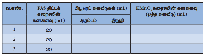 KMnO4 இணைப்புக் கரைசல் VS திட்ட FAS கரைசல்