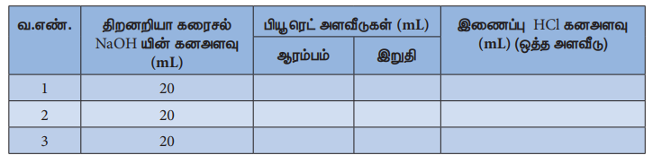 திறனறியா சோடியம் ஹைடிராக்சைடுகரைசலின் கனஅளவு (V1) = -----20----mL