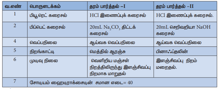 பருமனறி பகுப்பாய்வின் மூலம் கொடுக்கப்பட்டுள்ள செறிவறியா சோடியம் ஹைடிராக்சைடு கரைசலில் 250mLல் கரைந்துள்ள சோடியம் ஹைடிராக்சைடின் நிறையினைத் தீர்மானித்தல். இதற்கென, 0.0948N திறனுடைய திட்ட சோடியம் கார்பனேட் கரைசல் மற்றும் HC1 இணைப்புக் கரைசல் ஆகியன கொடுக்கப்பட்டுள்ளன.