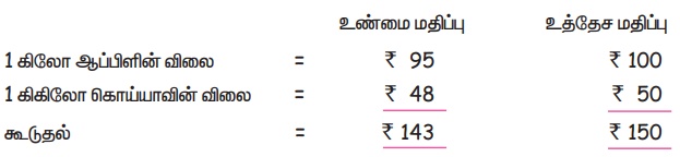 1 கிலோ ஆப்பிளின் விலை ₹ 95, 1 கிலோ கொய்யாவின் விலை ₹ 48 எனில், அவற்றின் விலைகளை அருகிலுள்ள பத்திற்கு முழுமைப்படுத்திக் கூட்டுக. மேலும் உத்தேச மதிப்பிற்கும் உண்மை மதிப்பிற்கும் இடையேயுள்ள வித்தியாசத்தைக் காண்க.