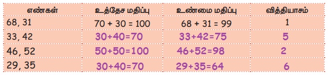 கொடுக்கப்பட்டுள்ள எண்களின் உத்தேச மதிப்புகளை எழுதி வகுத்தப் பிறகு, அவற்றின் உத்தேச மதிப்பிற்கும் உண்மையான மதிப்பிற்கும் இடையேயுள்ள வித்தியாசம் காண்க.