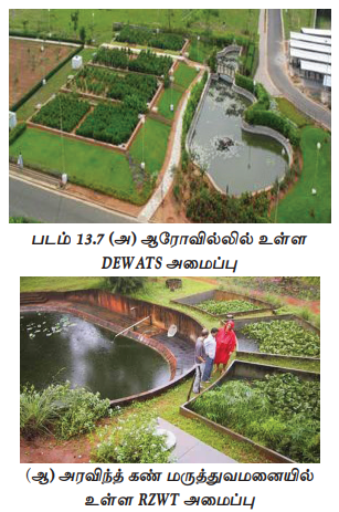 தனிநபர் ஆய்வு: தென்னிந்தியாவின், புதுச்சேரிக்கு அருகில் அமைந்துள்ள ஆரோவில்லில் சோதனை முறையில் இயற்கையான கழிவுநீர் மறுசுழற்சி அமைப்பு அமைக்கப்பட்டிருக்கிறது (பரவலாக்கப்பட்ட கழிவு நீர் சுத்திகரிப்பு அமைப்பு போன்றவை உள்ள டங்கும் (DEVATS- Decentralised Vastewater Treatment System)) (படம் 13.7 அ). தற்போது இதே போன்ற சுத்திகரிப்பு அமைப்பு அரவிந்த் கண் மருத்துவமனை, புதுச்சேரி (வேர் மண்டல கழிவு நீர் சுத்திகரிப்பு (RZVT - Root Zone Vater Treatment)) (படம் 13.7 ஆ) தகவல் தொழில்நுட்பப்பூங்கா, சிறுசேரி, சென்னை மற்றும் கணித நிறுவனம், சென்னை ஆகிய இடங்களில் அமைக்கப்பட்டுள்ளது.