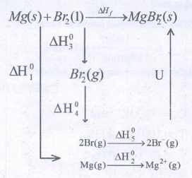 மெக்னீசியத்தின் பதங்கமாதல் வெப்பம் 148 kJ mol-1, திரவ புரோமினின் ஆவியாதல் வெப்பம் 31 kJ mol-1, புரோமின் வாயுவை, அணுக்களாக்க தேவைப்படும் பிரிகையடைதல் வெப்பம் 193 kJ mol-1, மெக்னீஷியத்தின் அயனியாக்கும் ஆற்றல்கள் முறையே IE1 = 737.5 kJ mol-1 மற்றும் IE2 = 1450.5 kJ mol-1, புரோமினின் எலக்ட்ரான் நாட்டம் - 324.5 kJ mol-1 எனில், மெக்னீஷியம் புரோமைடு படிகத்தின் படிகக்கூடு ஆற்றலைக் கணக்கிடு.