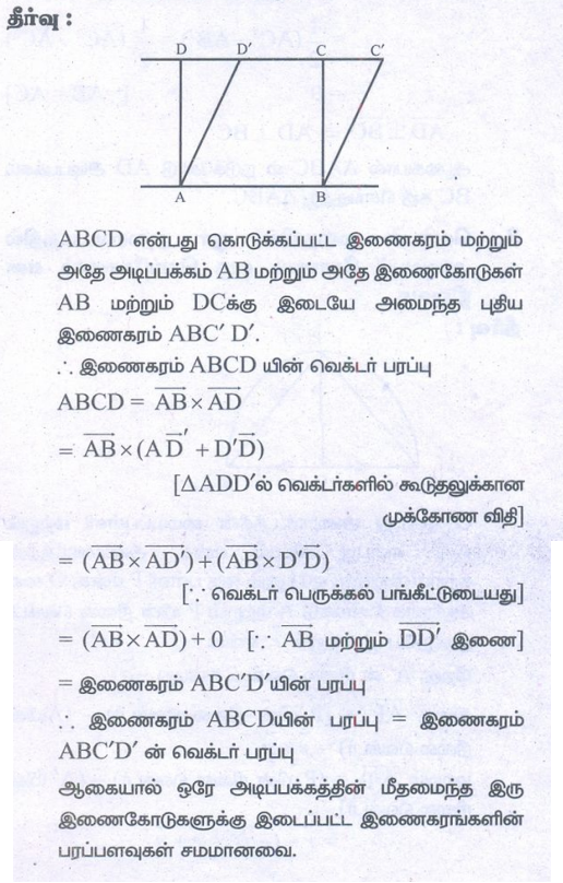 7. ஒரே அடிப்பக்கத்தின் மீதமைந்த இரு இணைகோடுகளுக்கு இடைப்பட்ட இணைகரங்களின் பரப்பளவுகள் சமமானவை என வெக்டர் முறையில் நிறுவுக.