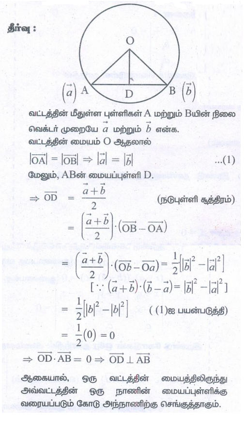1. ஒரு வட்டத்தின் மையத்திலிருந்து அவ்வட்டத்தின் ஒரு நாணின் மையப்புள்ளிக்கு வரையப்படும் கோடு அந்நாணிற்கு செங்குத்தாகும் என வெக்டர் முறையில் நிறுவுக.