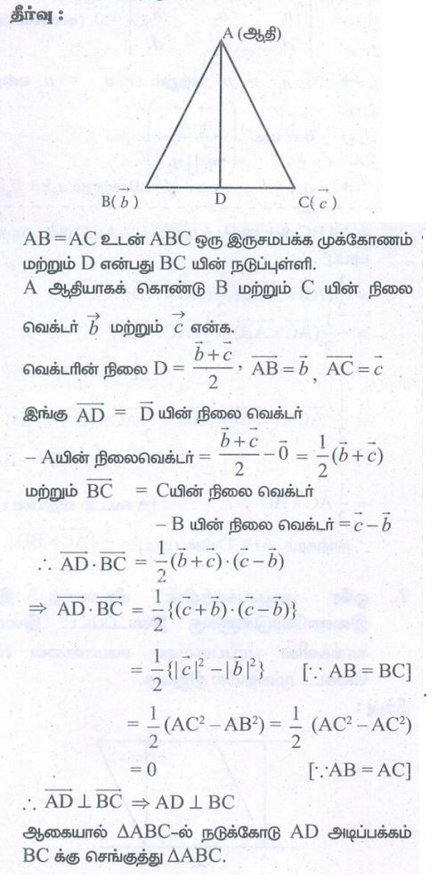 2. ஓர் இரு சமப்பக்க முக்கோணத்தின் அடிப்பக்கத்திற்கு வரையப்படும் நடுக்கோடு, அப்பக்கத்திற்கு செங்குத்தாகும் என வெக்டர் முறையில் நிறுவுக.
