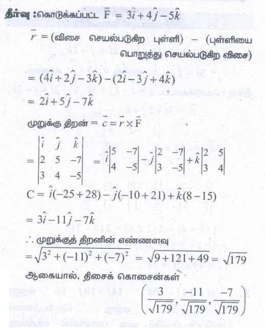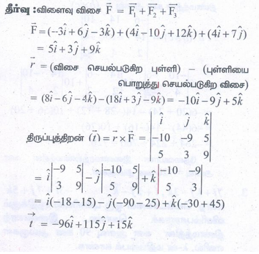 என்ற வெக்டரை நிலைவெக்டராகக் கொண்ட புள்ளியைப் பொறுத்து அவ்விசையின் திருப்புவிசையின் எண்ணளவு மற்றும் திசைக்கொசைன்களைக் காண்க.