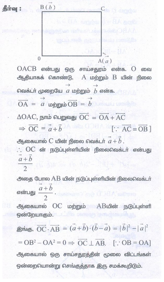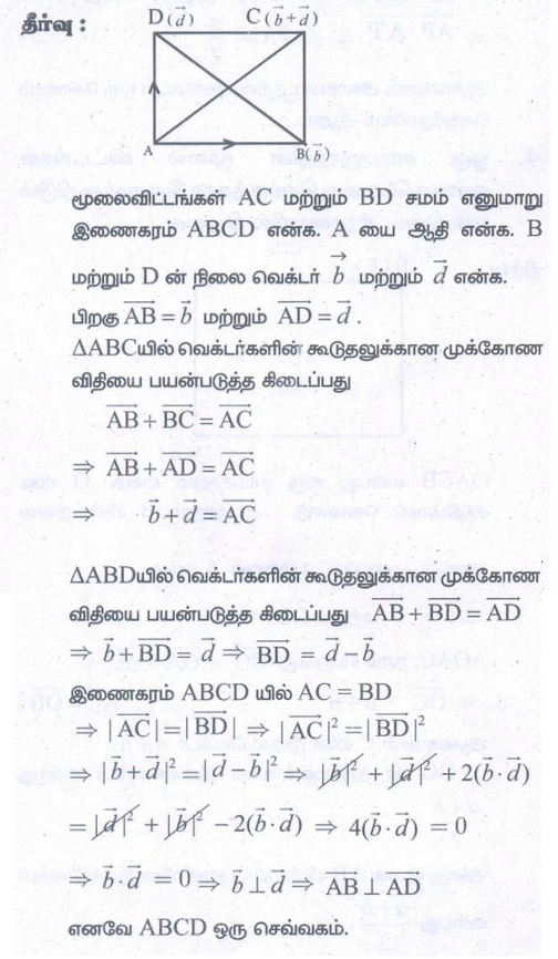 5. ஓர் இணைகரத்தின் மூலை விட்டங்கள் சமம் எனில், அந்த இணைகரம் ஒரு செவ்வகமாகும் என வெக்டர் முறையில் நிறுவுக.