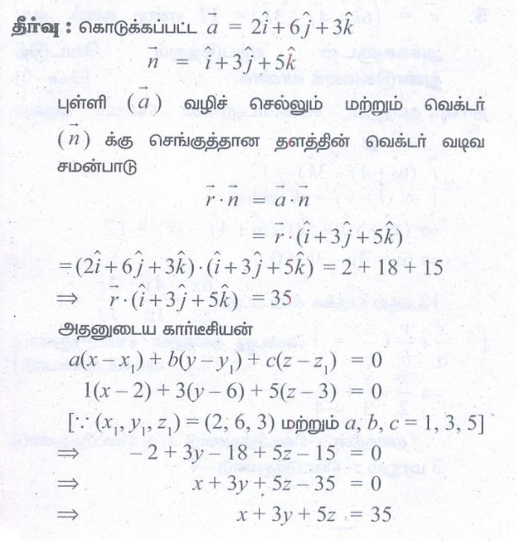 2. 12x+3y−4z =65 என்ற தளத்தின் செங்குத்தின் திசைக்கொசைன்களைக் காண்க. மேலும், தளத்தின் துணையலகு அல்லாத வெக்டர் சமன்பாடு மற்றும் ஆதியில் இருந்து தளத்திற்கு வரையப்படும் செங்குத்தின் நீளம் காண்க.
