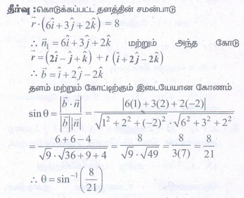 7. x−1 = y/2 = z+1 என்ற கோடும் 2x − y + 2z = 2 என்ற தளமும் சந்திக்கும் புள்ளியைக் காண்க. மேலும், இக்கோட்டிற்கும் தளத்திற்கும் இடைப்பட்ட கோணத்தையும் காண்க.