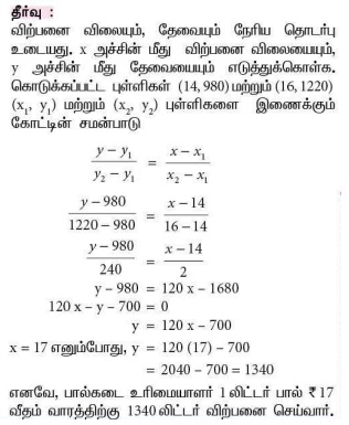 7. ஒரு பால்கடை உரிமையாளர் 1 லிட்டர் ₹16 வீதம் ஒரு வாரத்திற்கு 1220 லிட்டரும், 1 லிட்டர் ₹14 வீதம் ஒரு வாரத்திற்கு 980 லிட்டரும் விற்பனை செய்கிறார். விற்பனை விலையானது தேவையோடு நேரிய தொடர்பு உடையது என ஊகித்துக் கொண்டால், 1 லிட்டர், ₹17 வீதம் ஒரு வாரத்திற்கு எத்தனை லிட்டர் விற்பனை செய்வார்?