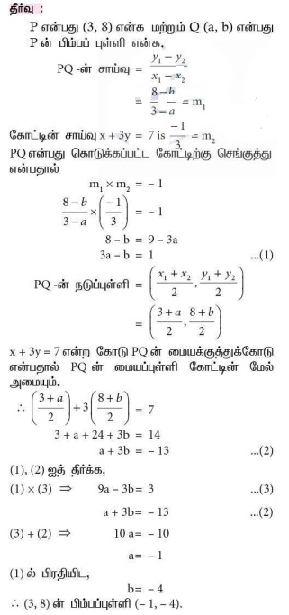 8. x + 3y = 7 என்ற நேர்க்கோட்டினைச் சமதள ஆடியாகக் கொண்டு (3,8) என்ற புள்ளியின் பிம்பப் புள்ளியைக் காண்க.