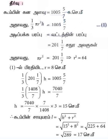 9. ஒரு கூம்பின் கன அளவு 1005 (5/7) க. செ.மீ மற்றும் கீழ் வட்டப்பரப்பு 201 (1/7) ச. செ.மீ எனில், அதன் சாயுயரம் காண்க.