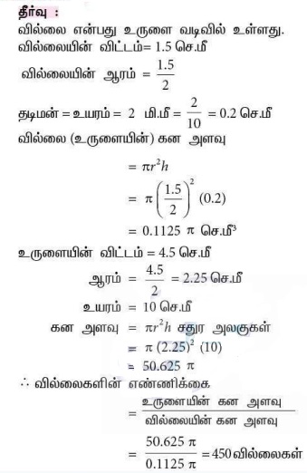 5. உயரம் 10 செ.மீ மற்றும் விட்டம் 4.5 செ.மீ உடைய ஒரு நேர்வட்ட உருளையை உருவாக்க 1.5 செ.மீ விட்டமும், 2 மி.மீ தடிமன் கொண்ட எத்தனை வட்ட வில்லைகள் தேவை?