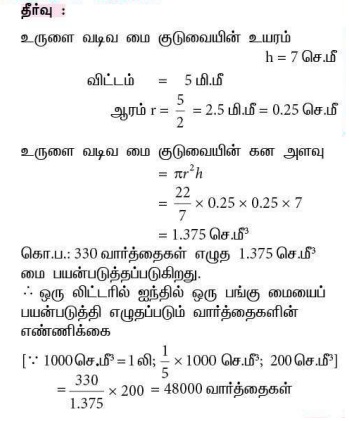 1. 7 செ.மீ நீளமுள்ள ஓர் உருளை வடிவ மை குடுவையின் விட்டம் 5 மி.மீ ஆகும். மை முழுமையாகவுள்ள உருளையைக் கொண்டு சராசரியாக 330 வார்த்தைகள் எழுதலாம். ஒரு லிட்டரில் ஐந்தில் ஒரு பங்கு மை ஒரு பாட்டிலில் உள்ளது எனில், அதனைப் பயன்படுத்தி எத்தனை வார்த்தைகள் எழுதலாம்?