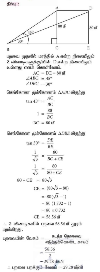 5. 80 மீ உயரமுள்ள மரத்தின் உச்சியில் ஒரு பறவை இருக்கிறது. தரையில் உள்ள ஒரு புள்ளியிலிருந்து பறவையின் ஏற்றக்கோணம் 45°. பறவை ஒரே உயரத்தில் கிடைமட்டத்தில் பறந்து செல்கிறது. 2 வினாடிகள் கழித்து அதே புள்ளியிருந்து பறவையின் ஏற்றக்கோணம் 30° எனில், பறவை பறக்கும் வேகத்தினைக் காண்க. (√3 = 1.732)