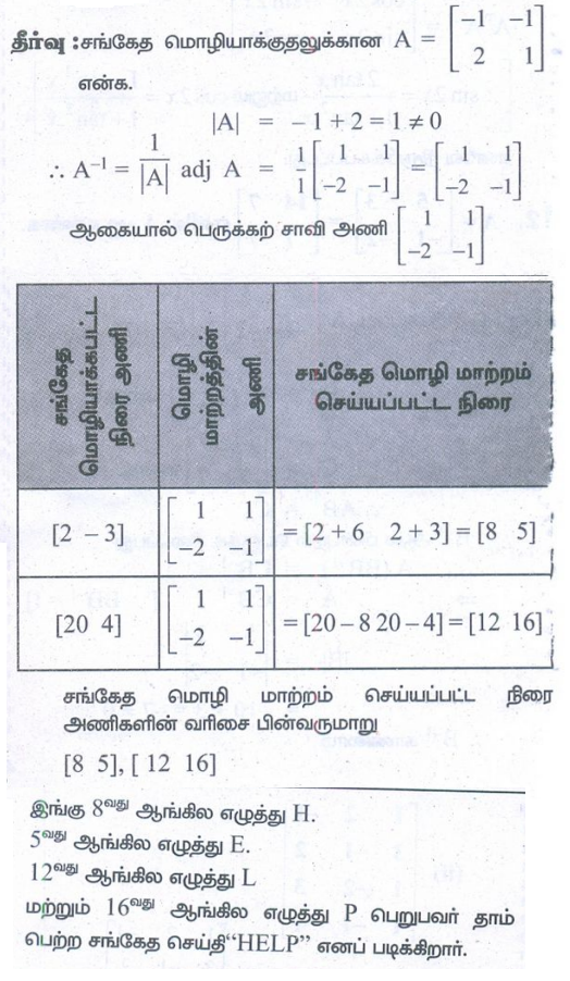 −ன் நேர்மாறு அணியின் பிந்தையப் பெருக்கற் சாவியாகக் கொண்டு சங்கேத மொழி மாற்றம் செய்க. இங்கு ஆங்கில எழுத்துகள் A − Z −க்கு முறையே எண்கள் 1 – 26 ஐயும், காலியிடத்திற்கு எண் 0 ஐயும் பொருத்தி சங்கேத மொழியாக்கம் மற்றும் மொழிமாற்றம் செய்க.