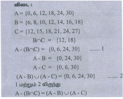 6. A = {x: x = 6n, n∈W மற்றும் n<6}, B = {x: x = 2n, n∈ℕ மற்றும் 2<n≤9} மற்றும் C = {x: x = 3n, n ∈ ℕ மற்றும் 4≤n<10} எனில், A − (B∩C) = (A − B) ∪ (A – C) எனக் காட்டுக.