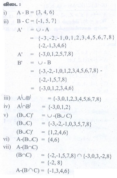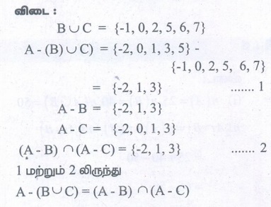 7. A = {−2, 0, 1, 3, 5}, B = {−1, 0, 2, 5, 6} மற்றும் C = {−1, 2, 5, 6, 7} எனில், A − (B∪C) = (A − B)∩(A – C) எனக் காட்டுக.