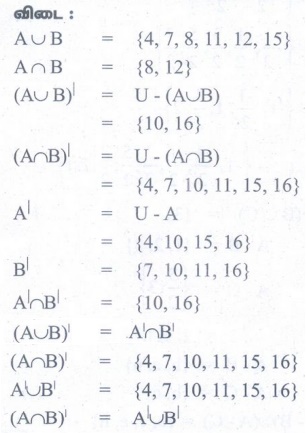 10. U = {4,7,8,10,11,12,15,16}, A={7,8,11,12} மற்றும் B = {4,8,12,15} எனில், டி மார்கனின் கணநிரப்பிக்கான விதிகளைச் சரிபார்க்க.