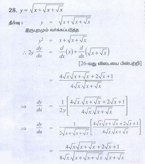 11 வது கணக்கு : அலகு 10 : வகை நுண்கணிதம் வகைமை மற்றும் வகையிடல் முறைகள் DIFFERENTIABILITY AND METHODS OF DIFFERENTIATION : பயிற்சி 10.3: சார்பின் சார்பினது வகைக்கெழு (இணைப்பு விதி) எடுத்துக்காட்டுகள் : பல்வேறு வினாக்களுக்கான பதில்கள் மற்றும் தீர்வுகள்