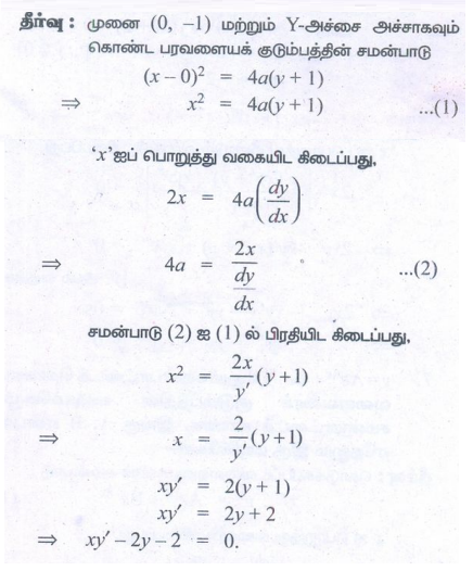 5. முனை (0,-1) மற்றும் y -அச்சை அச்சாகவும் கொண்ட பரவளையக் குடும்பத்தின் வகைக்கெழுச் சமன்பாட்டைக் காண்க.