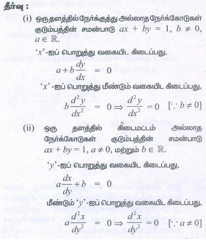 1. ஒரு தளத்தில் (i) நேர்க்குத்து அல்லாத நேர்க்கோடுகள் (ii) கிடைமட்டம் அல்லாதநேர்க்கோடுகள் ஆகிய தொகுப்புகளின் வகைக்கெழுச் சமன்பாடுகளைக் காண்க.