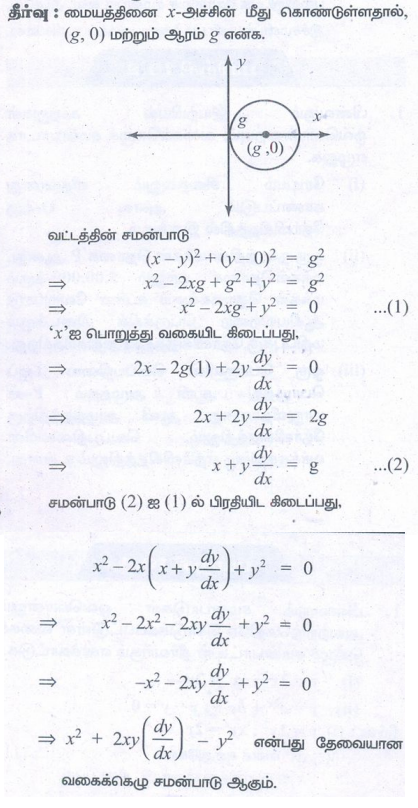 3. ஆதிப்புள்ளி வழியாகச் செல்லும், மையத்தினை x-அச்சின் மீது கொண்ட எல்லா வட்டங்களின் வகைக்கெழுச் சமன்பாட்டைக் காண்க.