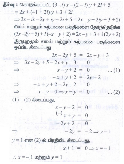 3. (3 − i)x − (2 − i)y + 2i + 5 மற்றும் 2x + (−1 + 2i)y + 3 + 2i ஆகிய கலப்பெண்கள் சமம் எனில் x மற்றும் y−ன் மதிப்புகளைக் காண்க.