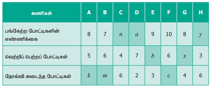 4. பின்வரும் அட்டவணையில், கால் புடி (கபடி) விளையாட்டுத் தொடர் போட்டியில் வெற்றி பெற்ற 8 அணிகளின் முடிவுகள் கொடுக்கப்பட்டுள்ளன.