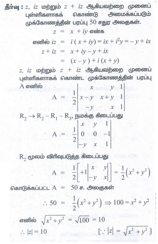 8. z, iz, மற்றும் z + iz ஆகியவற்றை முனைப்புள்ளிகளாகக் கொண்டு அமைக்கப்படும் முக்கோணத்தின் பரப்பு 50 சதுர அலகுகள் எனில், |z|−ன் மதிப்பினைக் காண்க.