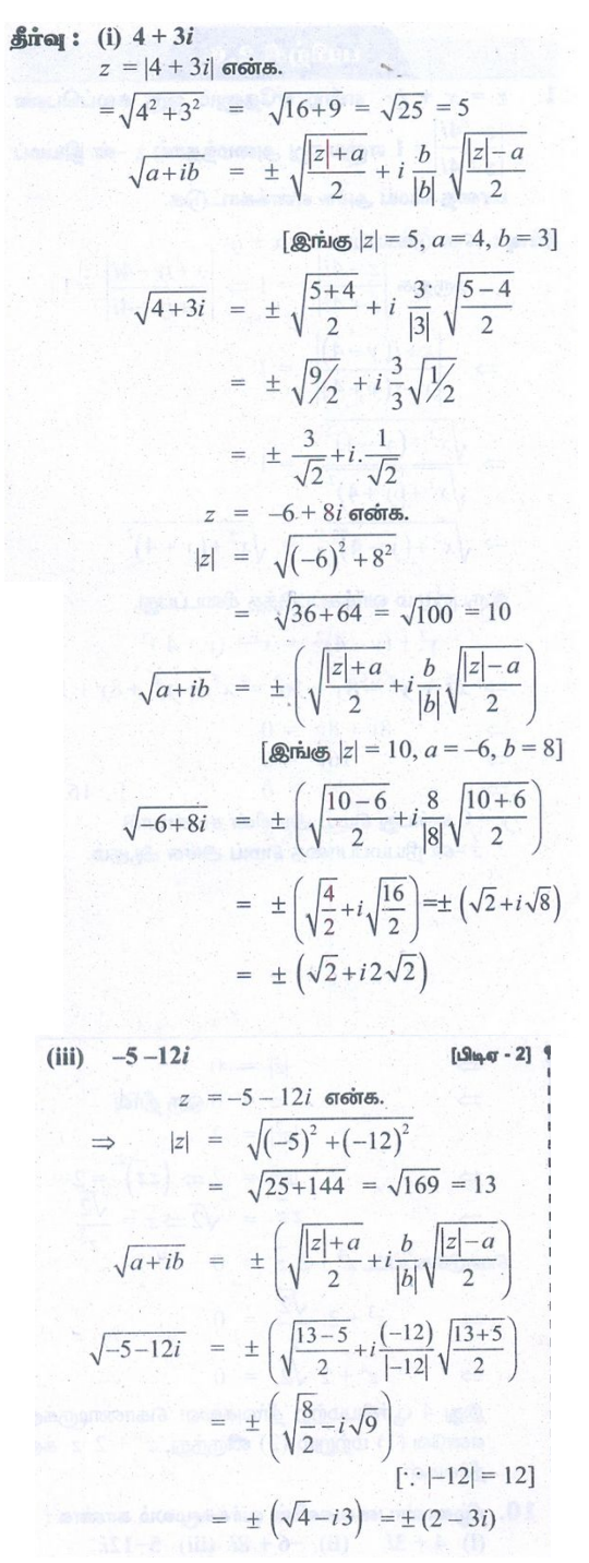 10. கீழ்க்காண்பவைகளின் வர்க்கமூலம் காண்க : (i) 4 + 3i (ii) −6 + 8i (iii) −5 −12i.