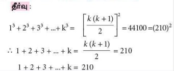3. 13 + 23 + 33 + ... + k3 = 44100 எனில், 1 + 2 + 3 + ... + k யின் மதிப்பு காண்க.